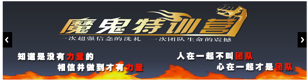 主題:魔鬼訓(xùn)練營(yíng)所要訓(xùn)練是對(duì)訓(xùn)練者情操、情商、行為標(biāo)準(zhǔn)的高度統(tǒng)一和品牌思維的高度關(guān)注度 讓訓(xùn)練者有更多的使命感、責(zé)任感、超越感,在終端市場(chǎng)上敢于亮劍,真正所到古代劍客一樣,敢于在任 何時(shí)候亮劍!敢于在任何時(shí)間進(jìn)行PK,結(jié)果訓(xùn)練的主題就是劍客精神、訓(xùn)練管理的力度、目標(biāo)達(dá)成的速度 像獵豹一樣撲向食物,把對(duì)手第一時(shí)間打到,歷練超越目標(biāo)的勇氣、激發(fā)潛能!就是在任何時(shí)候團(tuán)隊(duì)第一 互助第一,任何時(shí)候我們都能夠做到全力以赴,通過(guò)系列的極限挑戰(zhàn),像加西亞一樣為達(dá)成目標(biāo)而不懼怕 挑戰(zhàn)和艱難險(xiǎn)阻,這訓(xùn)練期間,我們只關(guān)注結(jié)果!